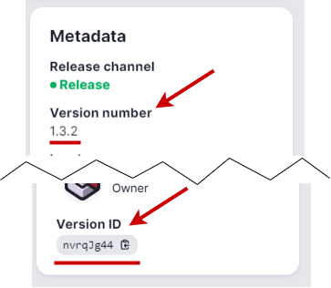 除了自动解析外,还可以通过将版本的页面 URL 传递给 MODRINTH_MODPACK(例如 https://modrinth.com/modpack/cobblemon-fabric/version/1.3.2)或通过将 MODRINTH_VERSION 设置为版本 ID 或编号(位于元数据部分,如下所示)来指定特定的模组包文件版本:
